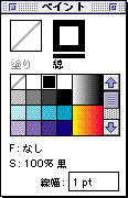 ![]() | まずペイント設定で線種を「塗り=なし」「線=黒」「太さ=1」に設定します。 |
