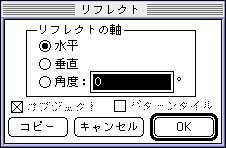 ![]() | ツールパレットから「回転ツール」を選択します。 時計周りに180度回転させます。回転させるには一度回転の中心をクリックし次にドラッグすると回転させる事ができます。45度や90度など一定の角度にしたい場合は回転中にシフトキーを押します。 |